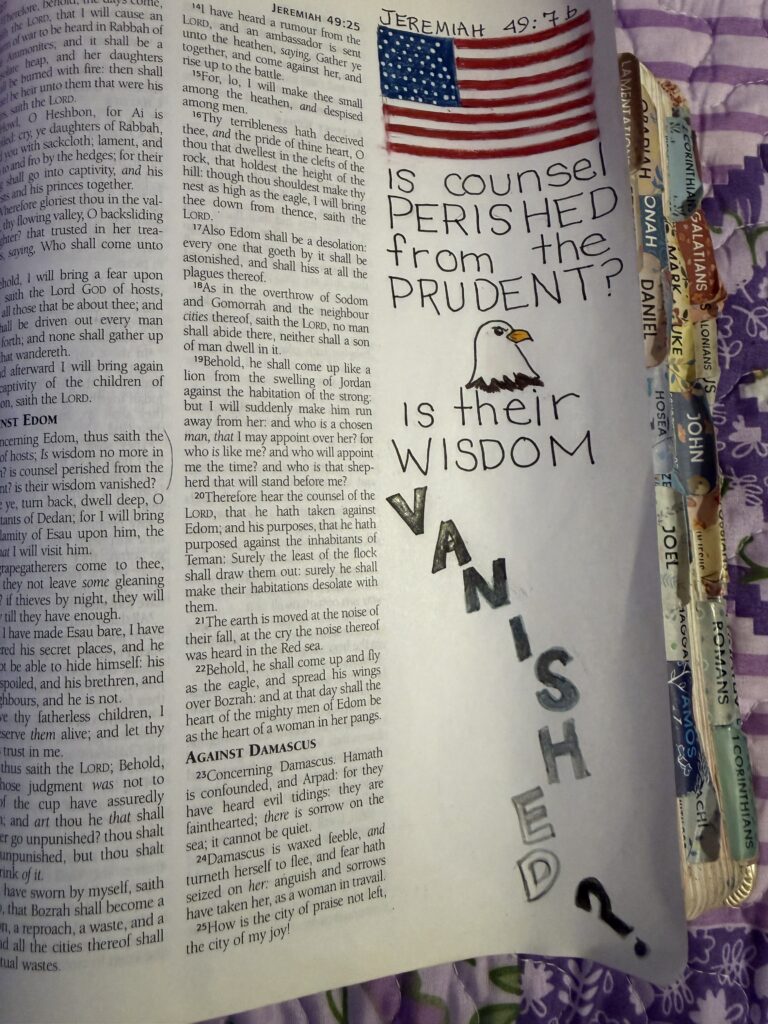 Jeremiah asks Edom, but I asked America, “is counsel perished from the prudent, is their wisdom vanished?” I don’t care what political party you look at, there is none that is following biblical principals. Yes, I am a Republican. For me it’s the closest I can get to the direction God wants us to go, at least locally. Meaning Calhoun County, West Virginia. Nationally… not so much. But let’s take politics out of it, and just talk about the average American community.