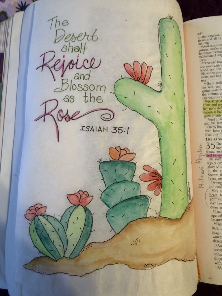 I’ve been feeling so guilty lately as I whine my way through life and sink into a puddle of despair. It’s not a pit… just a puddle. Just deep enough to leave my soul soggy and frustrated because life is hard. And then God begins to open my eyes to those who have problems so far beyond what I’m going through I’m heart sick. All around me is abuse, loss, depression, sickness and children living in depravity beyond where our mind can travel and I begin to realize God is doing a work in me. This bible journaling experience has become a counseling session between me and the Lord. The last couple of days have been pretty intense. I hope at the end of this message your soul will be encouraged and refreshed as a cool glass of water in the dessert… because that’s where I landed.